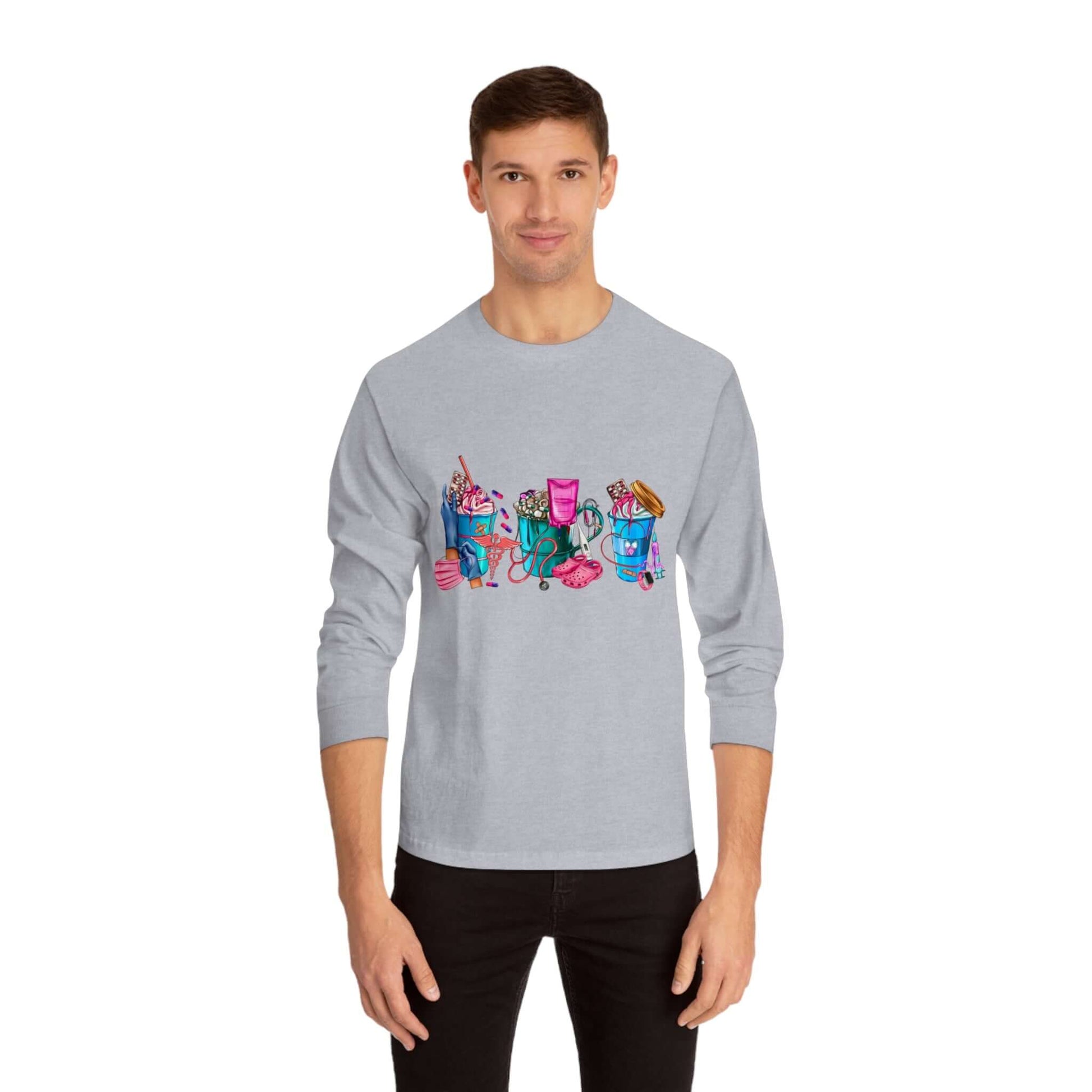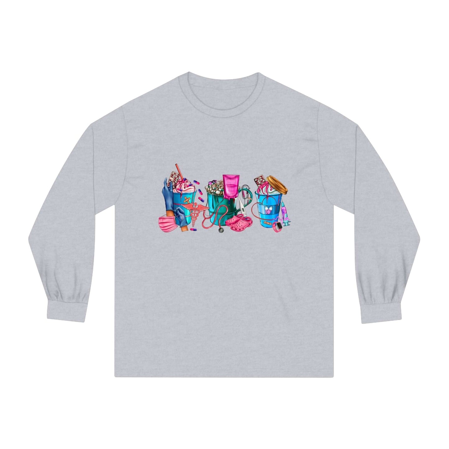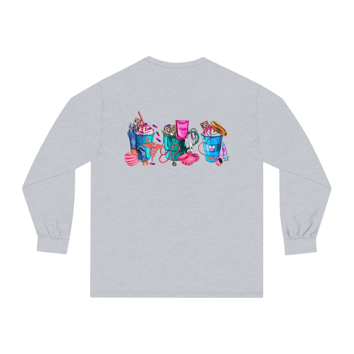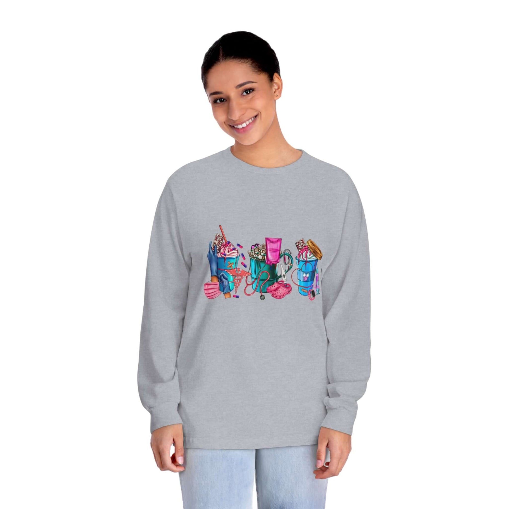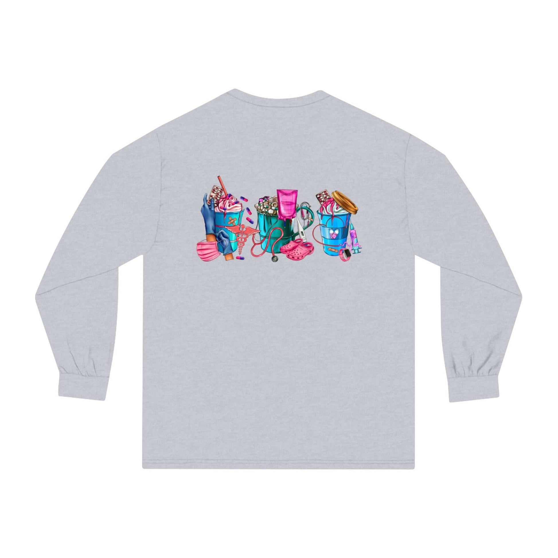 Nurses-Life long-sleeve detailed graphic shirts. Stays comfy throughout the day. Made with 100% US cotton (Athletic Heather is 90% US cotton 10% polyester),