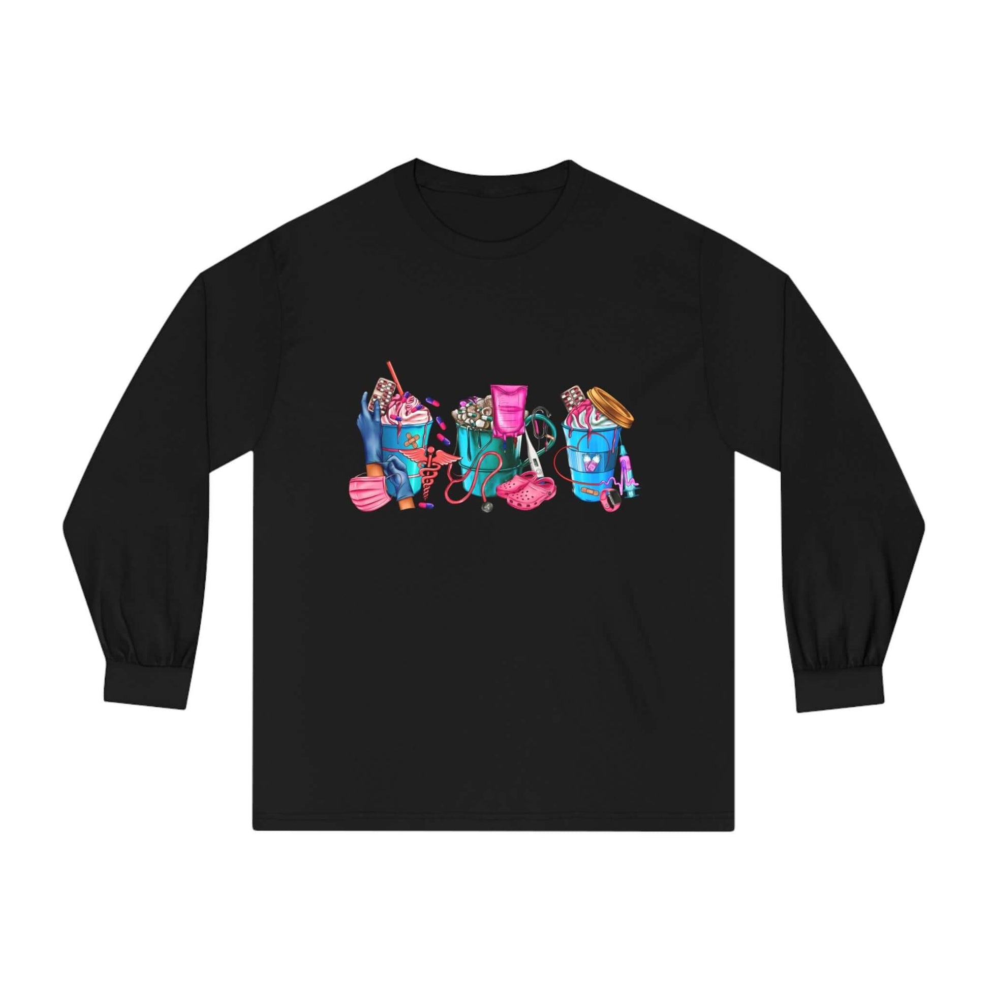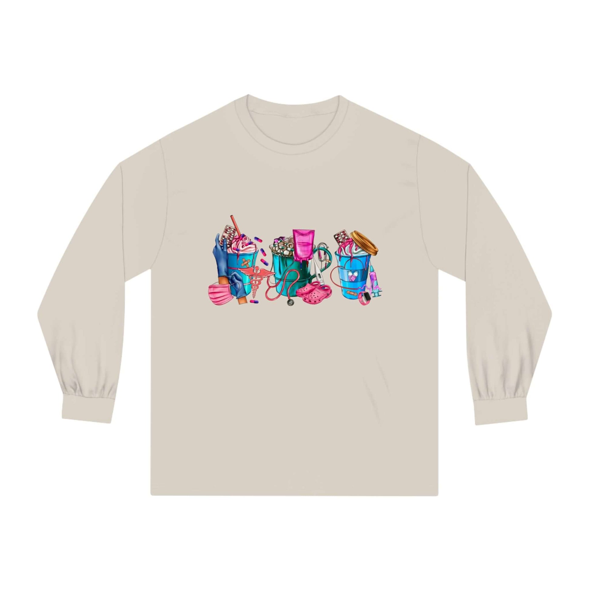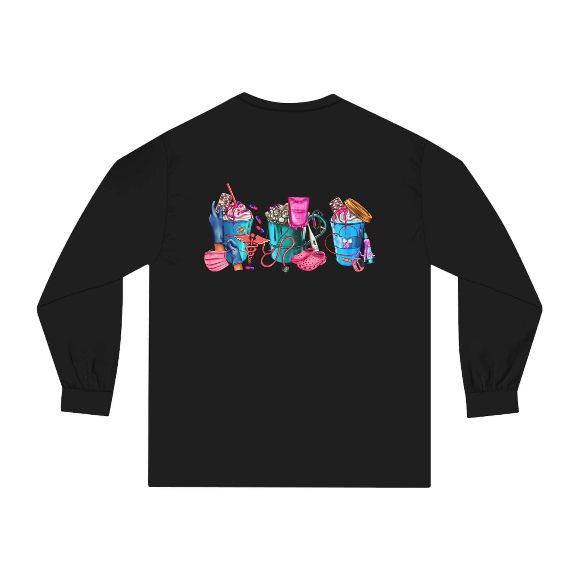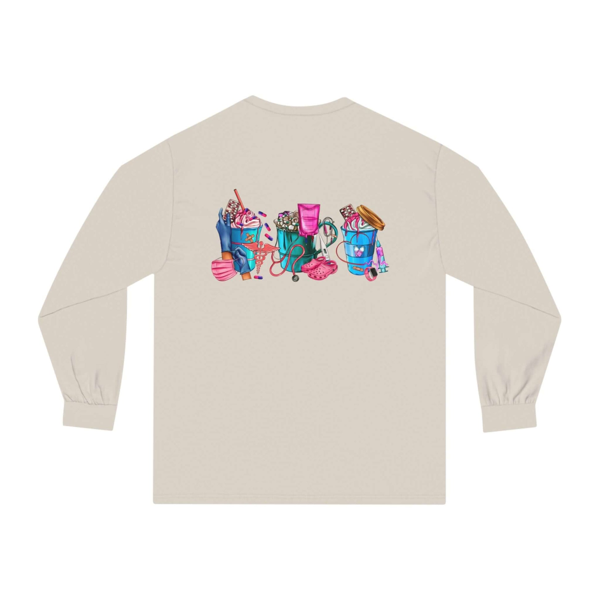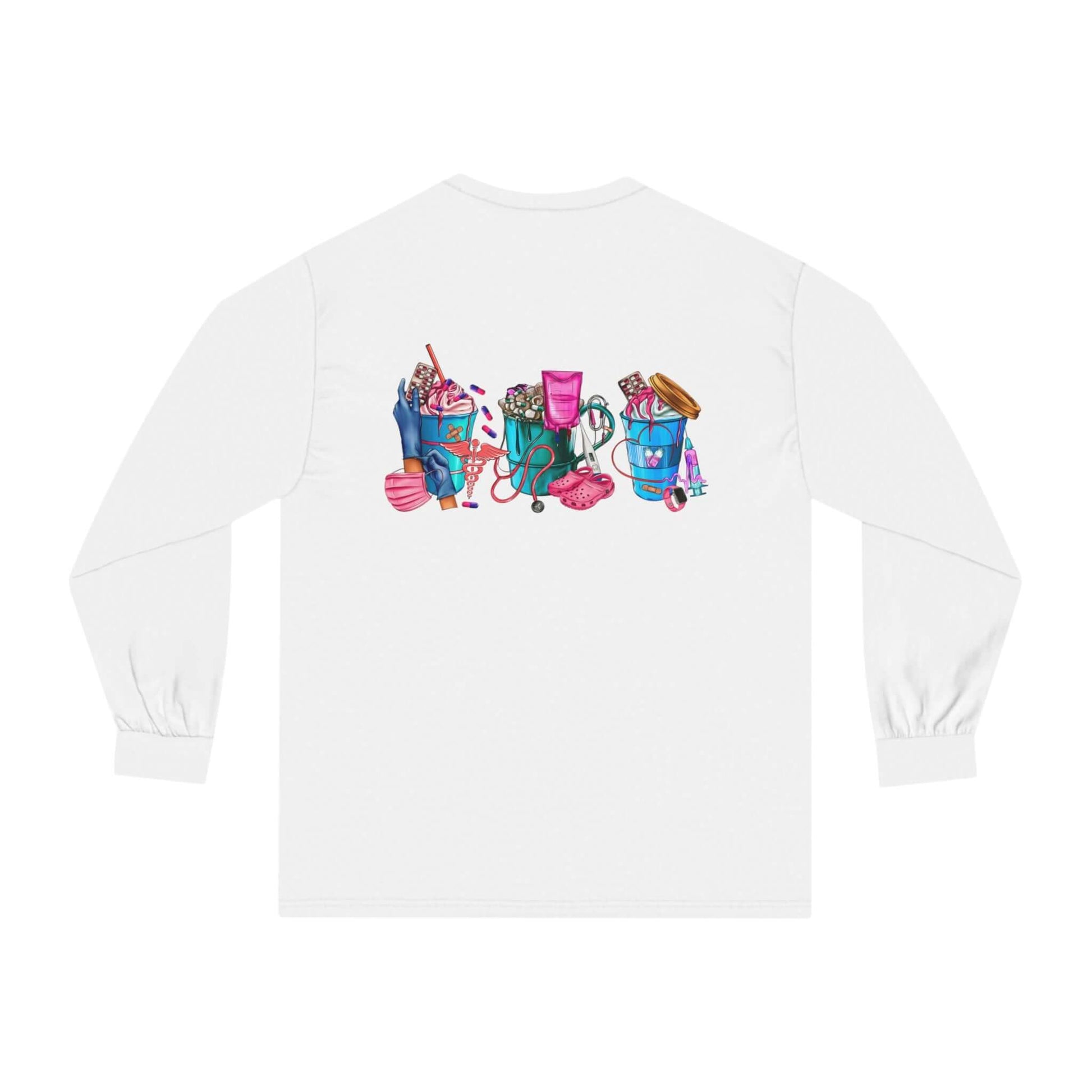 Nurses-Life long-sleeve detailed graphic shirts. Stays comfy throughout the day. Made with 100% US cotton (Athletic Heather is 90% US cotton 10% polyester),