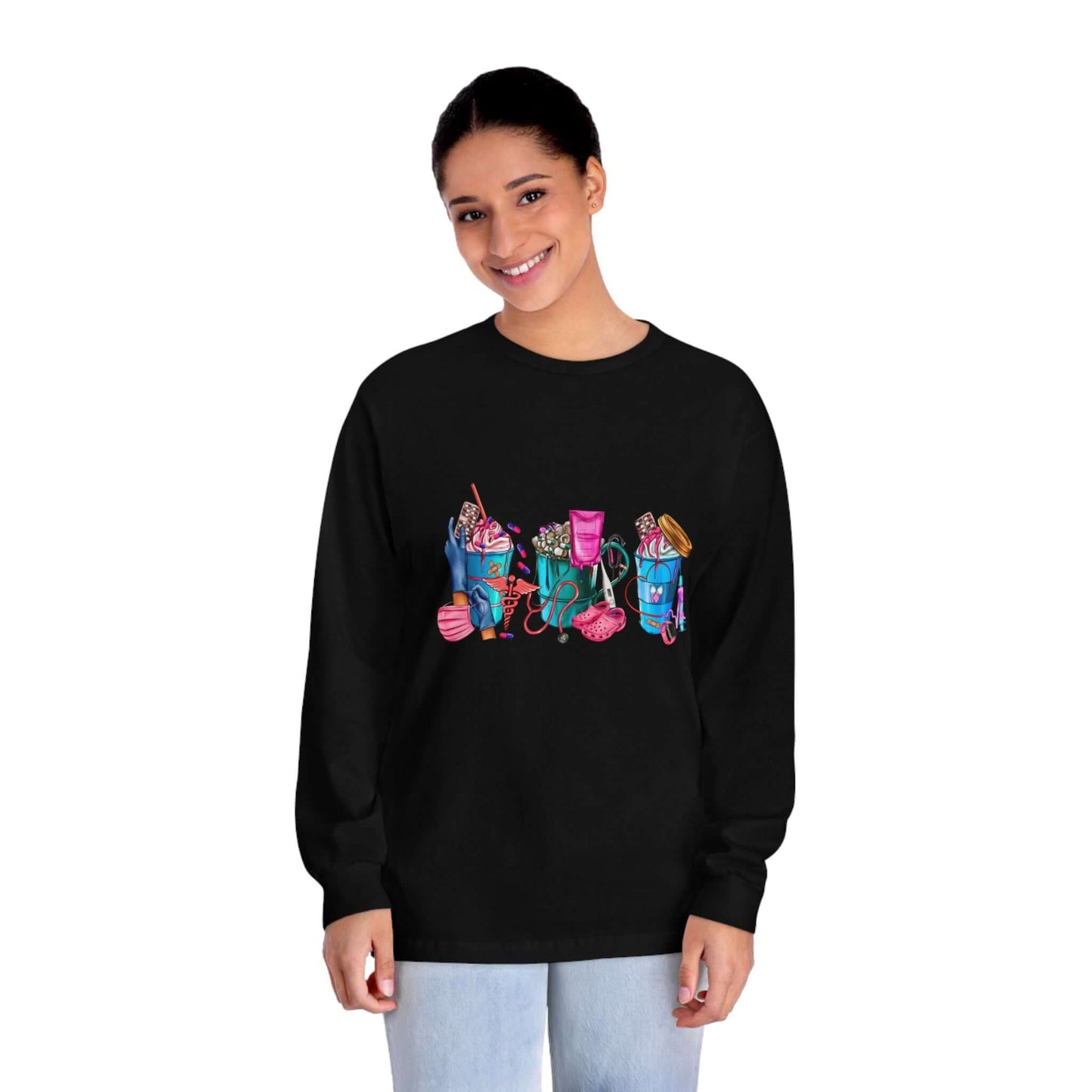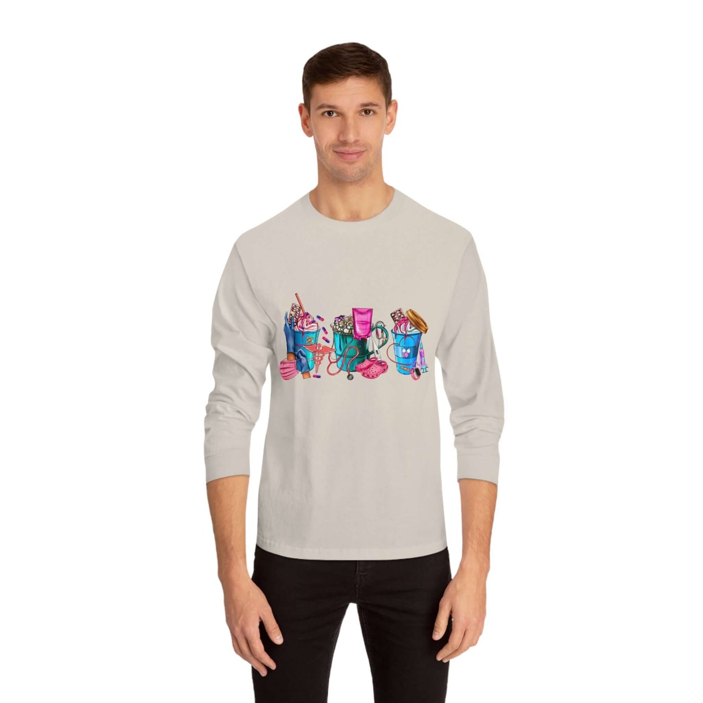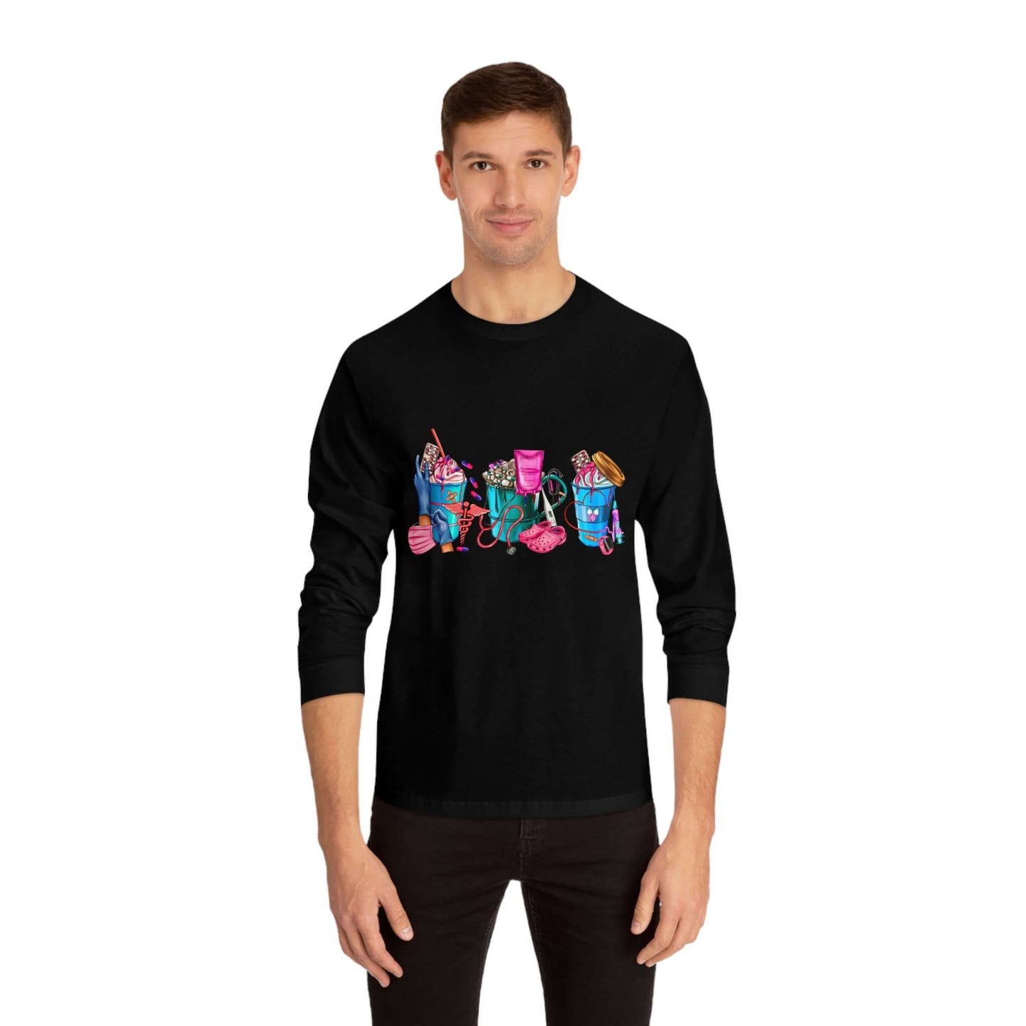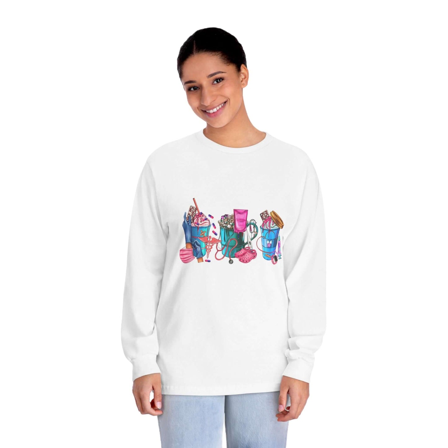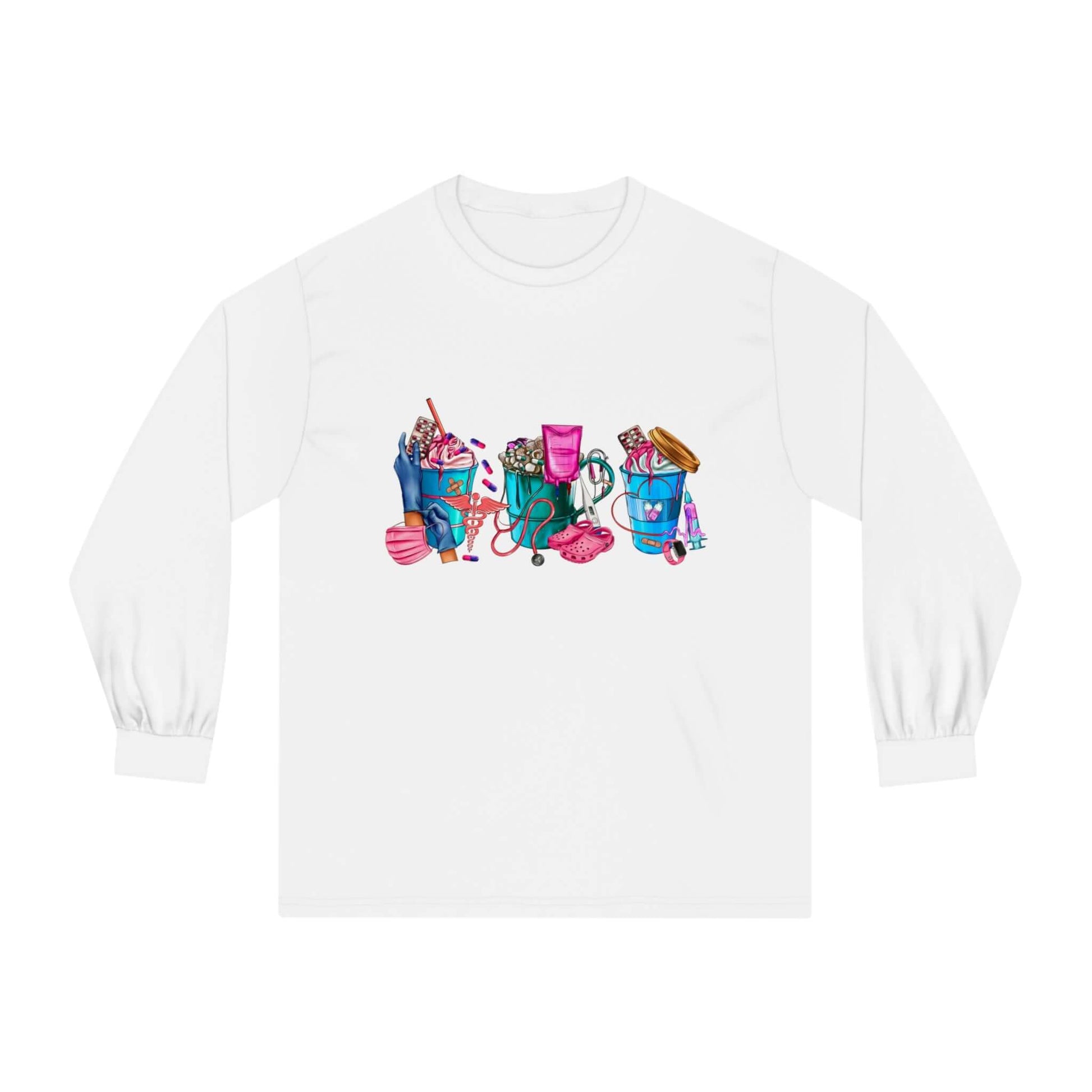 Nurses-Life long-sleeve detailed graphic shirts. Stays comfy throughout the day. Made with 100% US cotton (Athletic Heather is 90% US cotton 10% polyester),