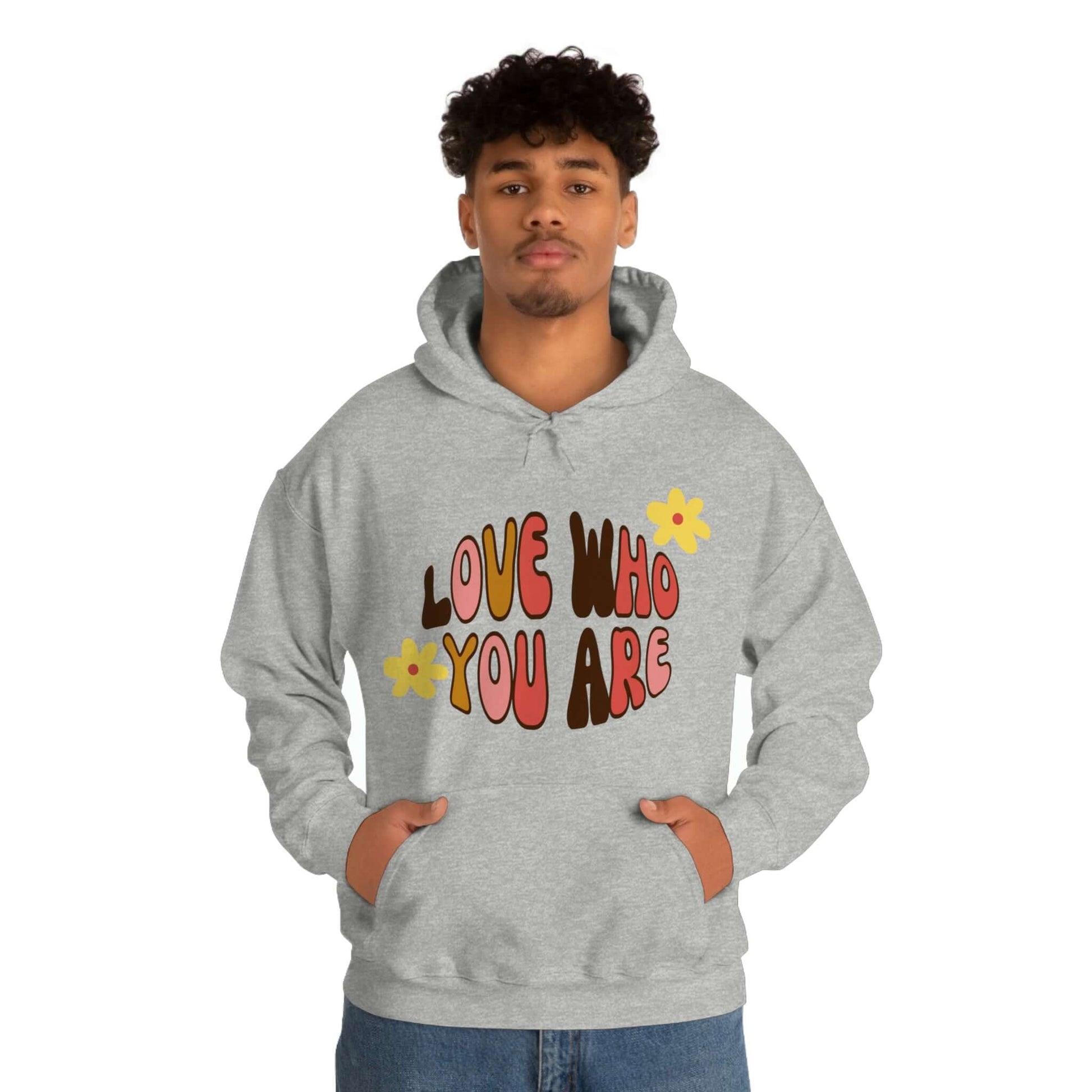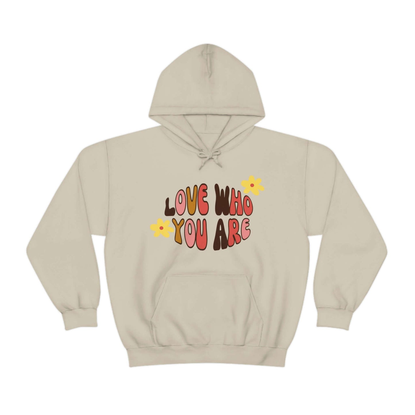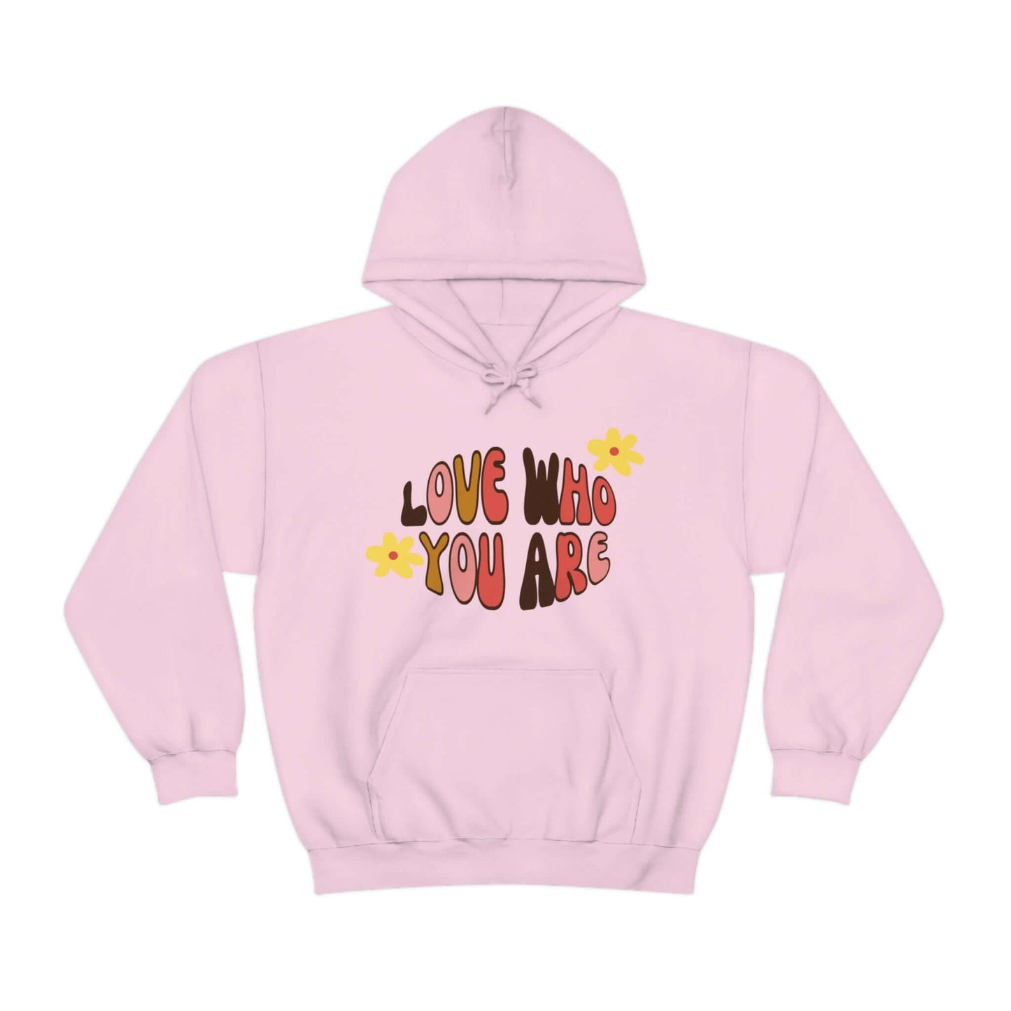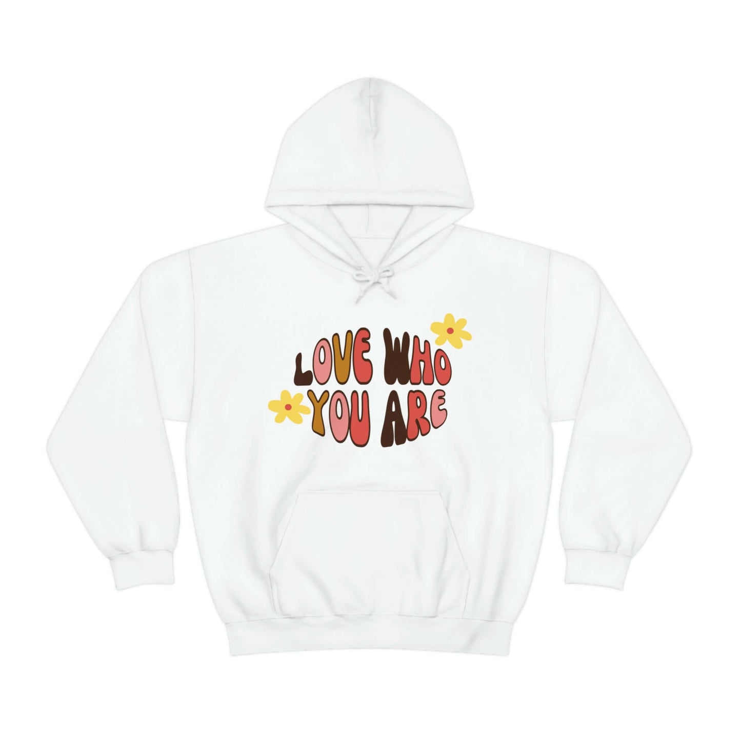 Add a little positive affirmation to your day with our Exclusive "love Who You Are" warm heavy blend hoodie Made with a thick blend of cotton and polyester, it feels plush, soft and warm, a perfect choice for any cold day. In the front, the spacious kangaroo pocket adds daily practicality while the hood's drawstring is the same color as the base sweater for extra style points.