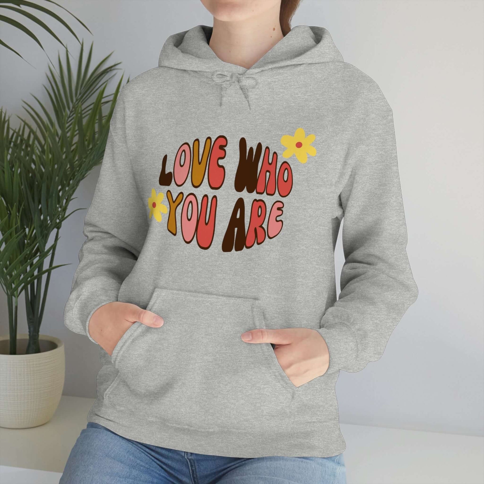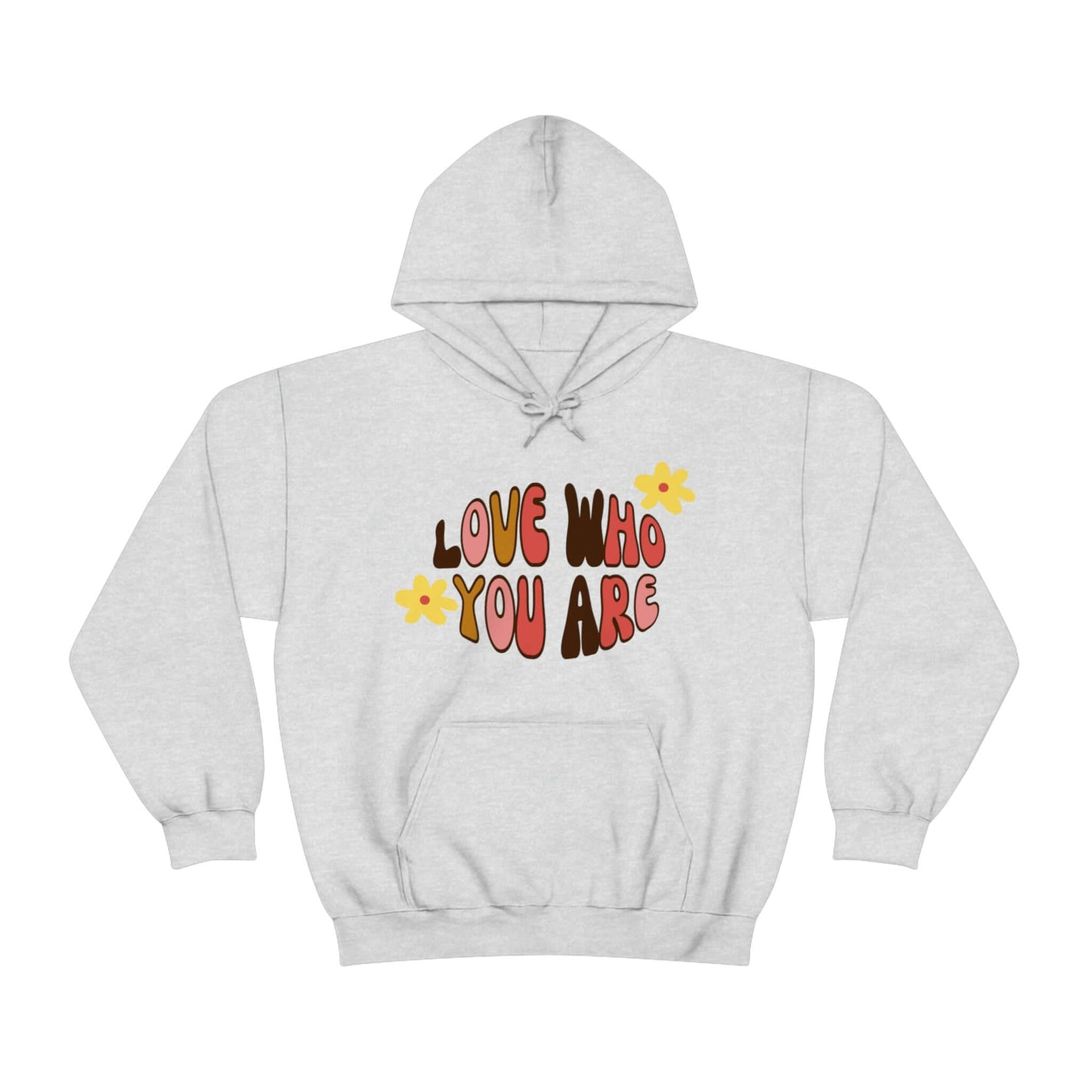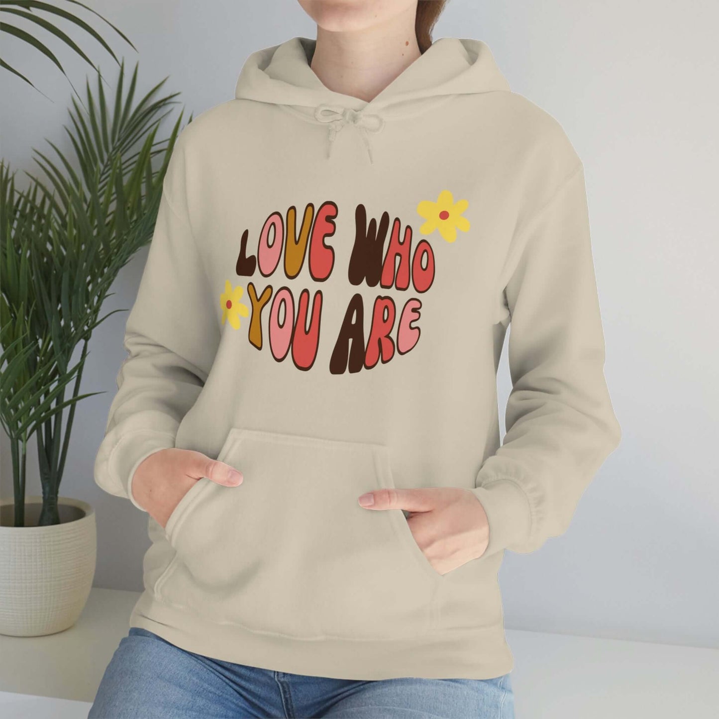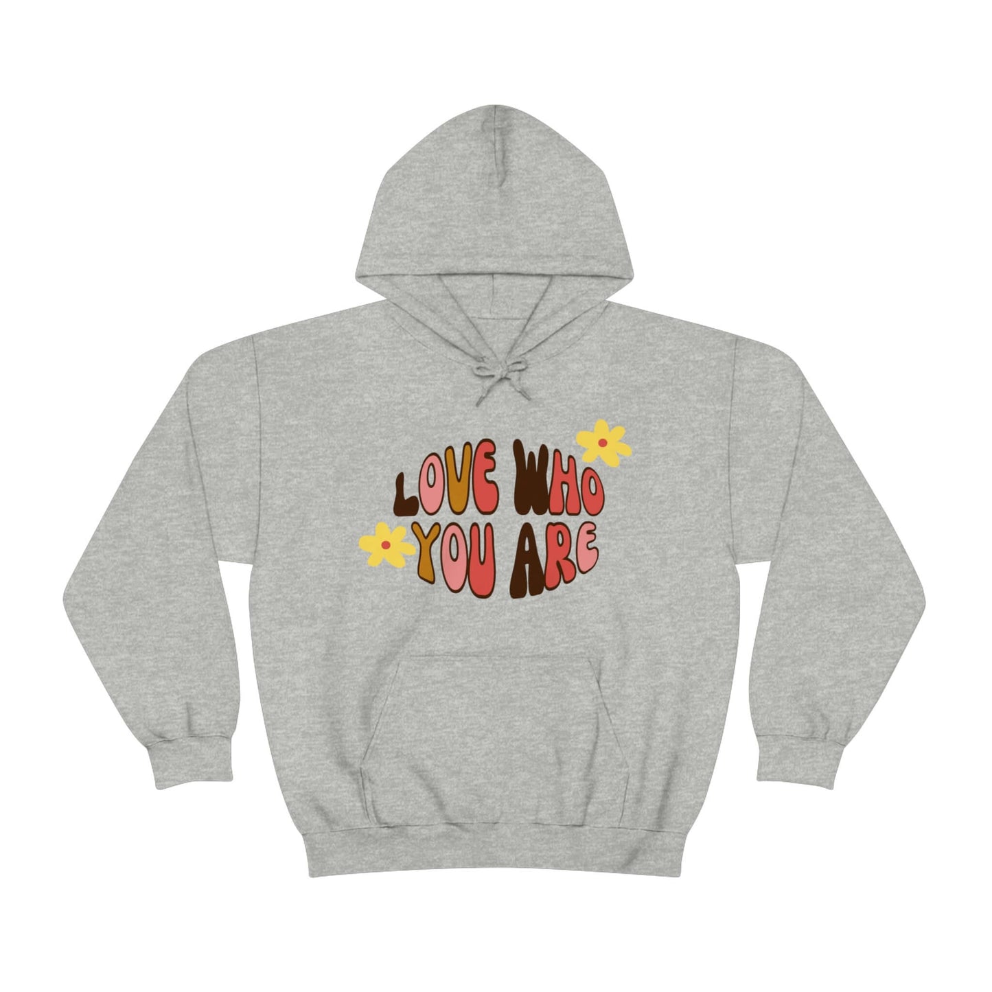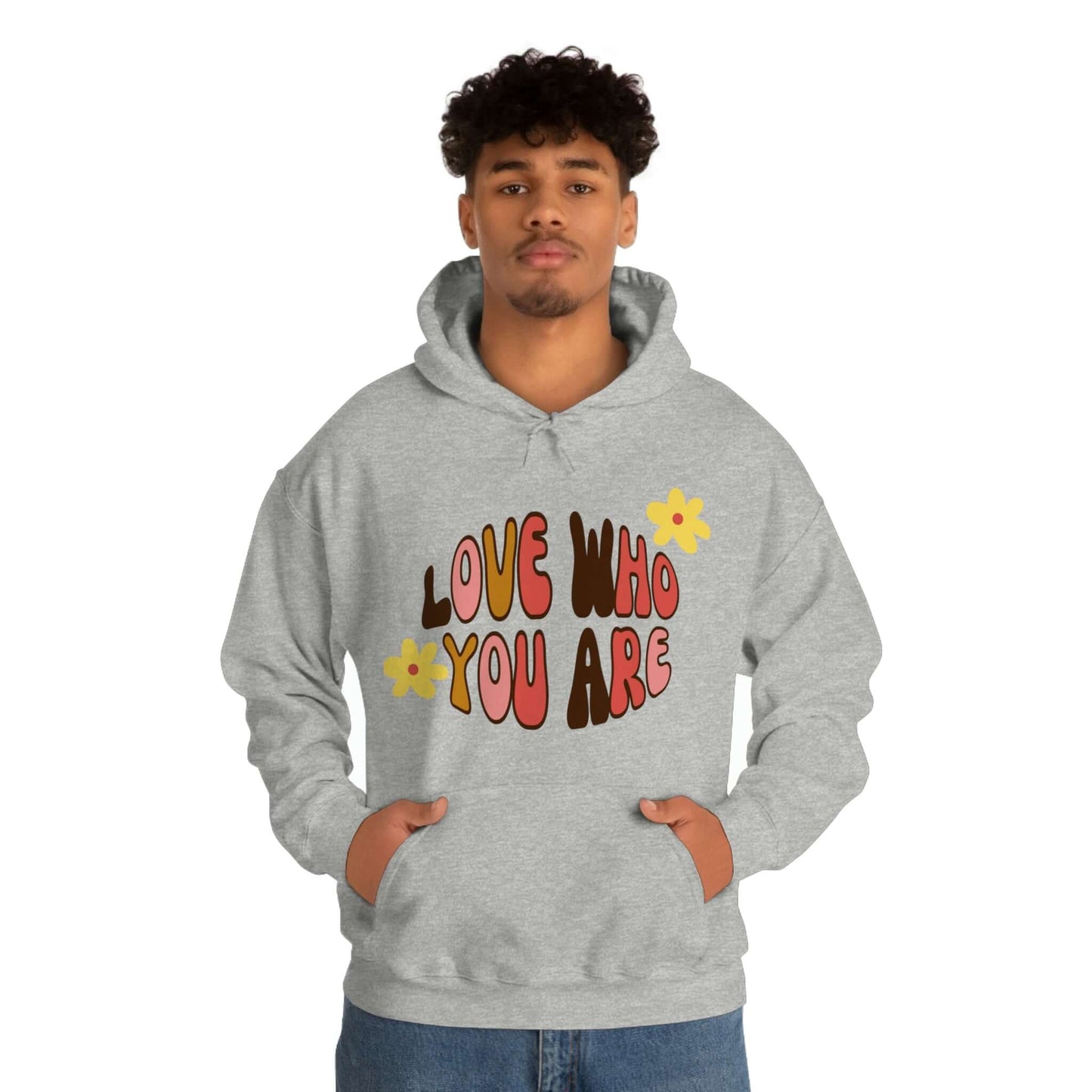 Add a little positive affirmation to your day with our Exclusive "love Who You Are" warm heavy blend hoodie Made with a thick blend of cotton and polyester, it feels plush, soft and warm, a perfect choice for any cold day. In the front, the spacious kangaroo pocket adds daily practicality while the hood's drawstring is the same color as the base sweater for extra style points.